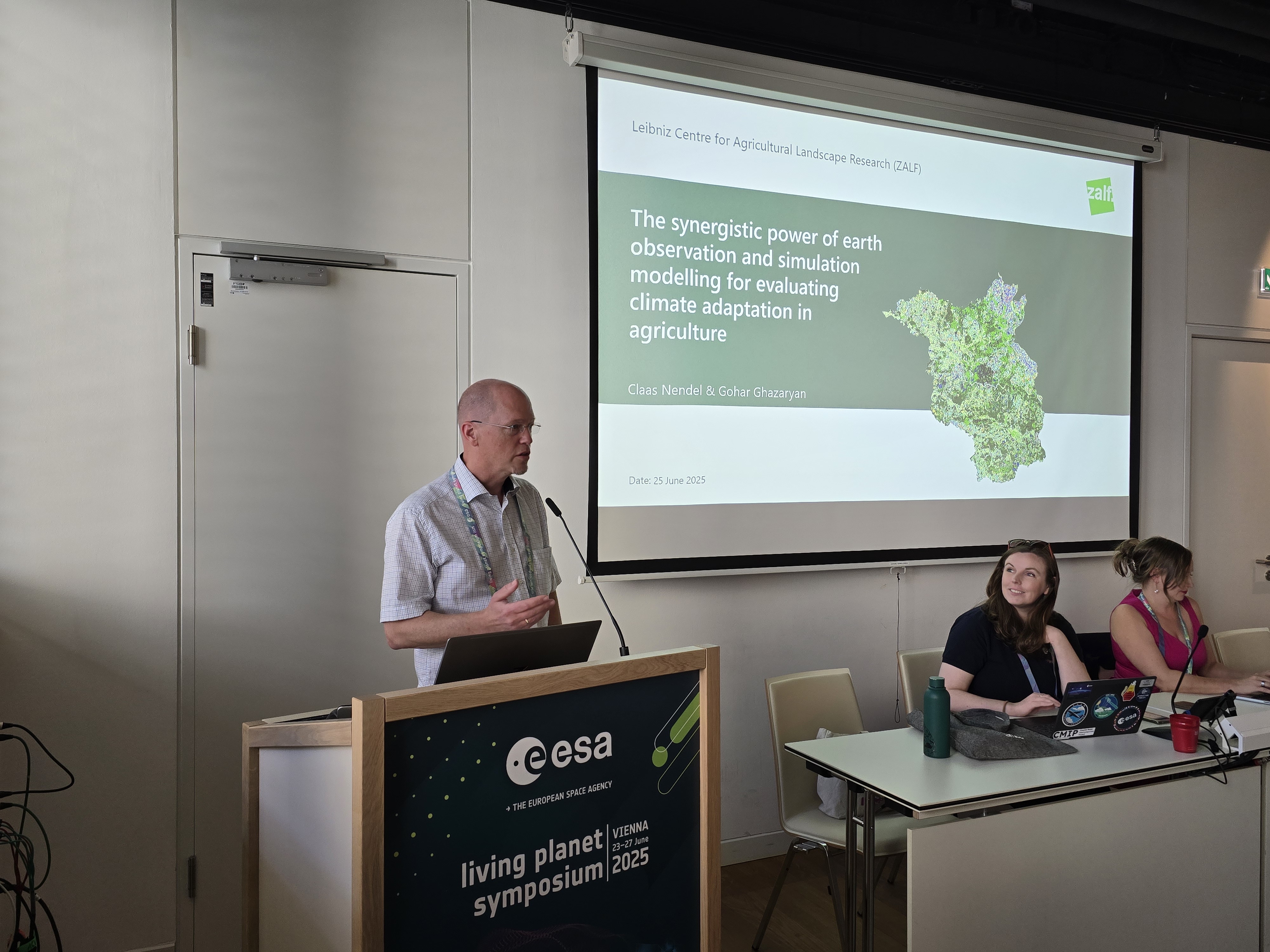 A key scientific contribution came from Prof. Claas Nendel, who presented on the integration of Earth observation and simulation modelling to evaluate climate adaptation strategies in agriculture. In the session on monitoring and measuring climate adaptation, he outlined how EO-informed models can enhance understanding of crop responses and regional adaptation capacities. His talk also emphasized the reciprocal value of EO data and model outputs in capturing the complexity of agricultural systems, underscoring ZALF’s long-term contribution to process-based modelling and systems analysis.