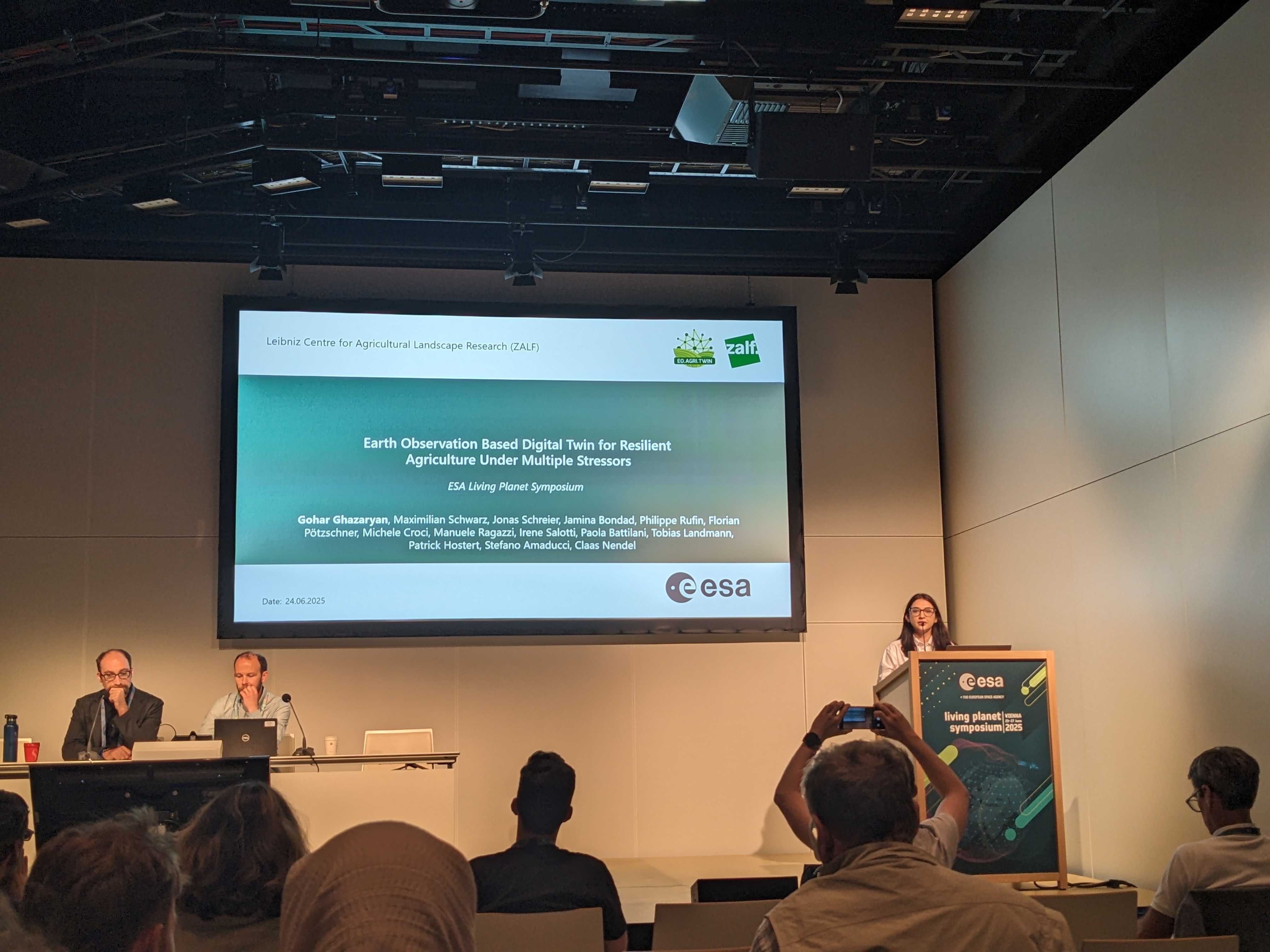 A key focus of ZALF’s contributions was the ZALF-led EOAgriTwin project, Earth Observation based Digital Twin for Resilient Agriculture under Multiple Stressors that integrates earth observation (EO) data and models crop responses to drought, heat, pests, and management practices such as irrigation. Dr. Gohar Ghazaryan presented the project’s concept, current results, and functionalities.